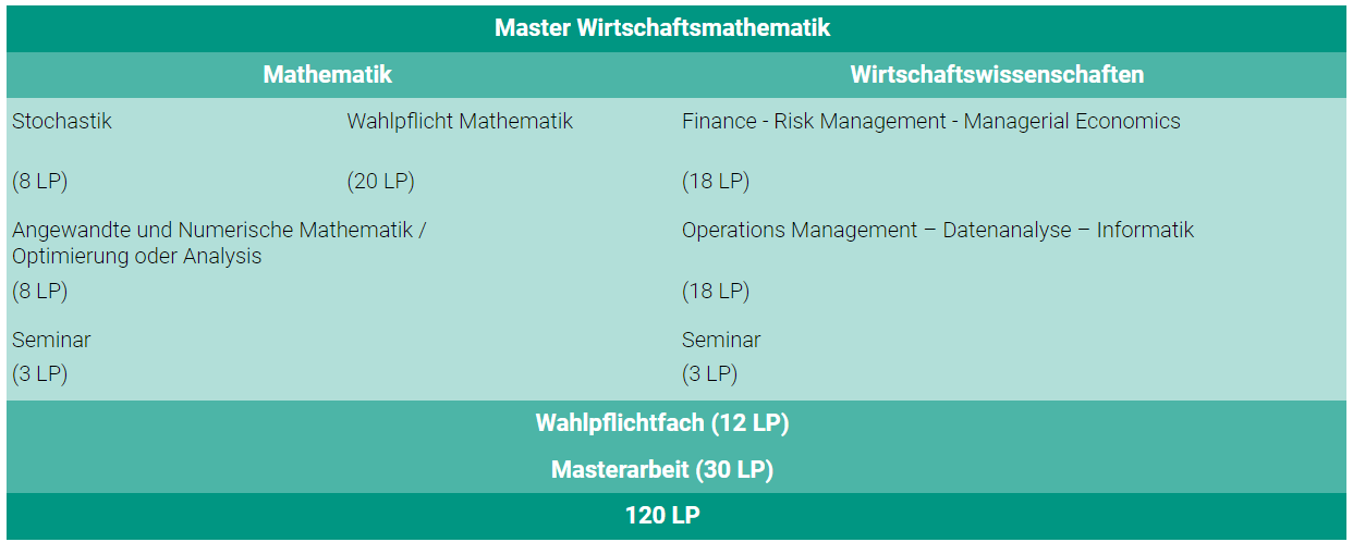 Die Masterarbeit kann in Mathematik oder Wirtschaftswissenschaften betreut werden.