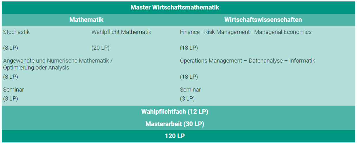 Das Masterstudium ist sehr flexibel aufgebaut. Es gibt keine festen Pflichtveranstaltungen, sondern Pflichtbereiche mit großer Modulauswahl in den folgenden Bereichen der Mathematik sowie Wirtschaftswissenschaften: